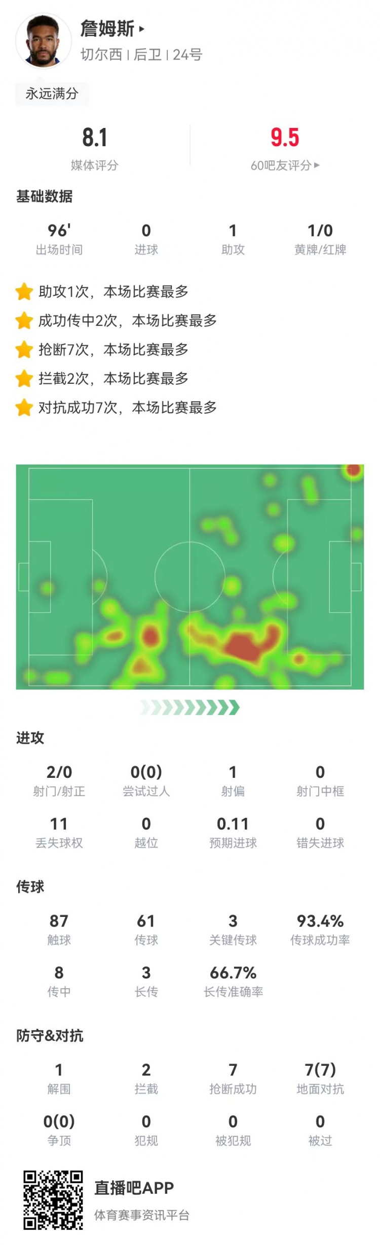 12月28日讯 切尔西在本轮英超对阵维拉,詹姆斯本场数据如下: